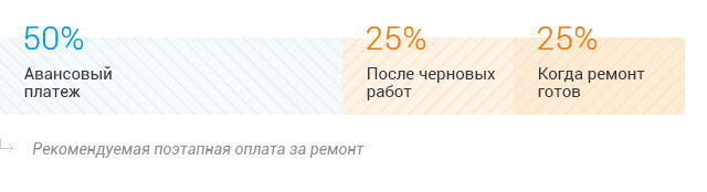Как правило, большинство организаций работает по такой схеме: 50% стоимости ремонта вы оплачиваете сразу, 25% — по окончании черновых работ, и 25% — после приемки вами квартиры с готовым ремонтом «под ключ».